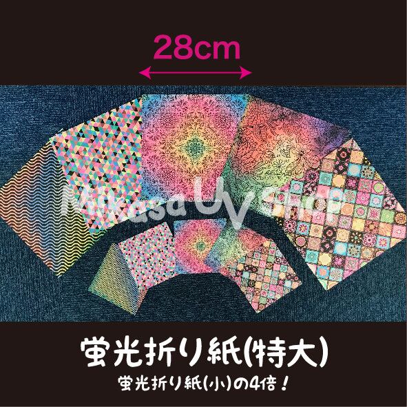 ブラックライトで光る「蛍光折り紙」の特大サイズ、28cm×28cmです。